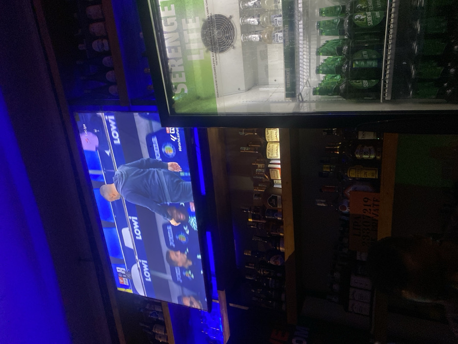 bar interior in Mbinga, Tanzania (latitude: -10.947, longitude: 34.997). A large flat-screen TV displays a soccer match with the players wearing blue and white uniforms. One player is prominently displayed, wearing a dark blue jacket and dark pants, with a bright blue background behind them. The screen displays a “LaLiga” logo, which indicates a Spanish soccer league. The word “Lowi” is displayed several times on the TV, suggesting a sponsor. In the foreground, a large refrigerator labeled “Serengeti Lite” contains various green and clear bottles of beer, organized into rows on shelves. The refrigerator door is open, revealing additional rows of beer bottles. Beneath the TV are multiple rows of liquor bottles, arranged on a wooden shelf. The top shelf appears to be filled with bottles of whiskey, and the bottom shelf contains several bottles of beer and liquor. A small sticker on the bottom shelf is labeled “Lida 2307219 Private”. Behind the bar, a person's head is partially visible, and they appear to be facing the TV. The bar interior is dark and dimly lit, and the walls are painted a dark blue color. The overall scene suggests a lively atmosphere with people enjoying a game and drinks.