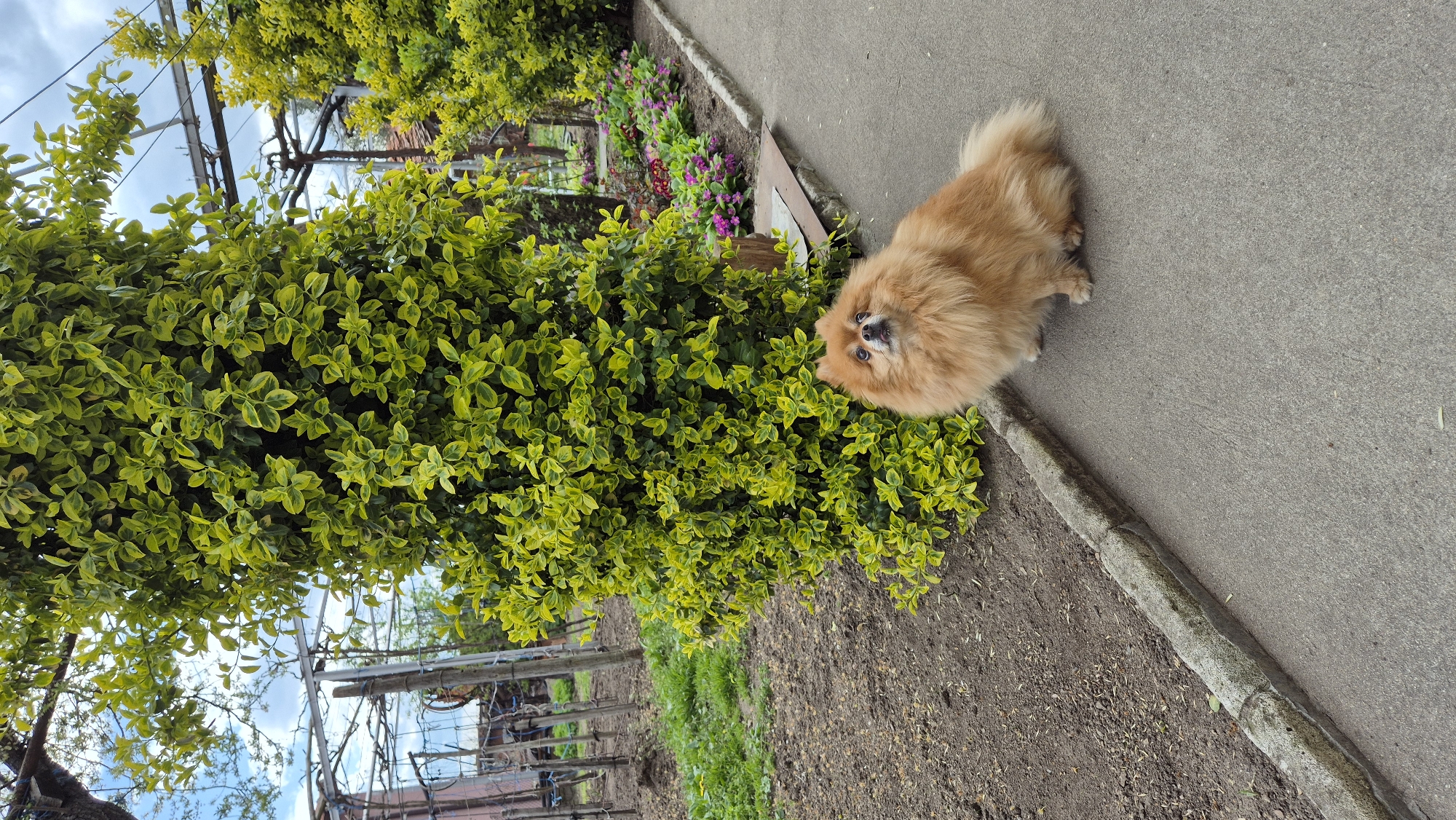 A tilted, medium shot shows a fluffy, tan-colored Pomeranian dog standing on a grey concrete sidewalk, next to a patch of soil and a tall, green shrub. The shrub, covered in small, variegated green and yellow leaves, extends from the bottom left corner of the image, rising upwards. Behind the shrub is a garden area with a trellis-like structure and rows of plants. The location appears to be outside, likely in a residential area. The top of the image shows a portion of the blue sky. The Pomeranian is looking toward the camera. Based on the information given, the location is Shivachevo, Bulgaria.