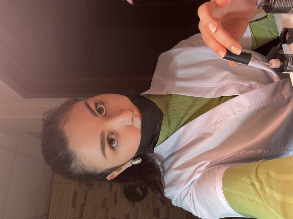 The image depicts a female individual in a selfie-style shot, located within an indoor professional setting in Neftekamsk, Russia. The subject has dark hair pulled back, brown eyes, and wears a black disposable face mask pulled down to rest below her chin, exposing red-tinted lips. She is dressed in a light green ribbed turtleneck top beneath a white, V-neck smock or lab coat. A silver, U-shaped earring is visible in her left ear. Her right hand, positioned in the lower-right foreground, holds a nail polish brush, dipped in a light pink/nude nail polish from an uncapped bottle, above another open bottle of similar nail product. Her fingernails display a light, possibly clear or faded polish. The background to the left features a light-colored, textured wall with a dark, circular wall ornament. The background to the right is dark and indistinct. The scene is illuminated by artificial light, imparting a warm, reddish cast to the environment.