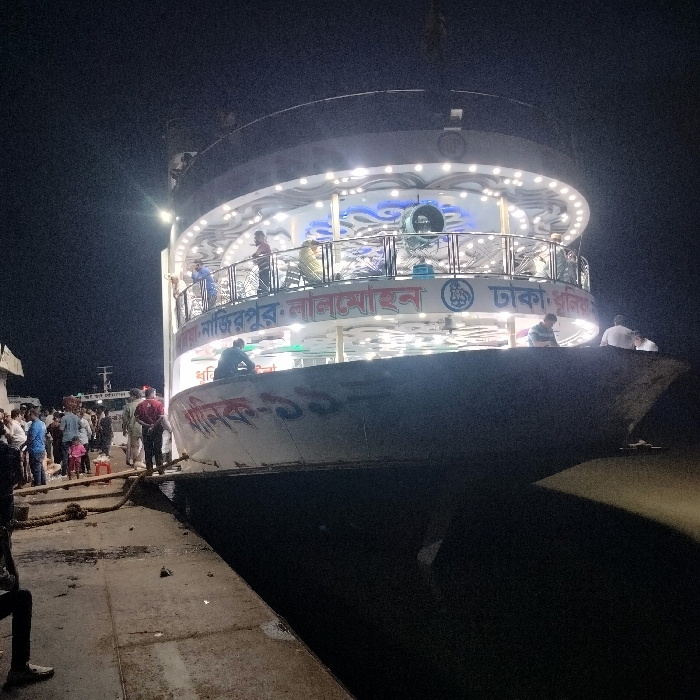 - "At night, a multi-decked passenger ferry, identified by Bengali script as "মণিঅক-১১" (Monik-11) and displaying routes "ঢাকা" by FM-CC0ji2, licensed under CC BY 4.0