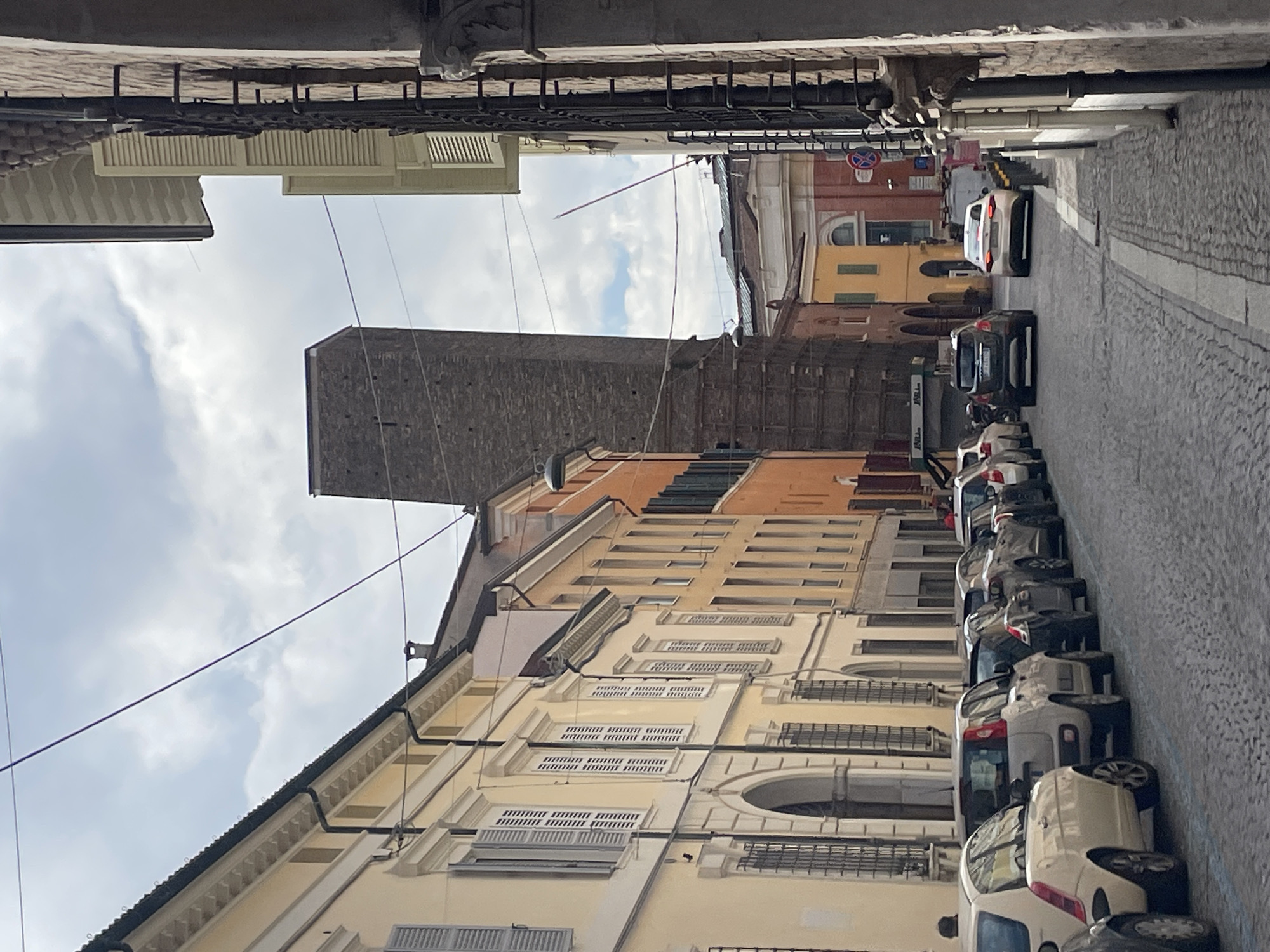 The image captures a narrow street in Ravenna, Italy, lined with parked cars on the right and old buildings on both sides. The architecture is a mix of styles, with windows, shutters, and decorative elements. In the background, a tall tower stands out against the cloudy sky. Overhead wires are visible between the buildings. The street surface appears to be paved with cobblestones. There are no people visible in the frame.