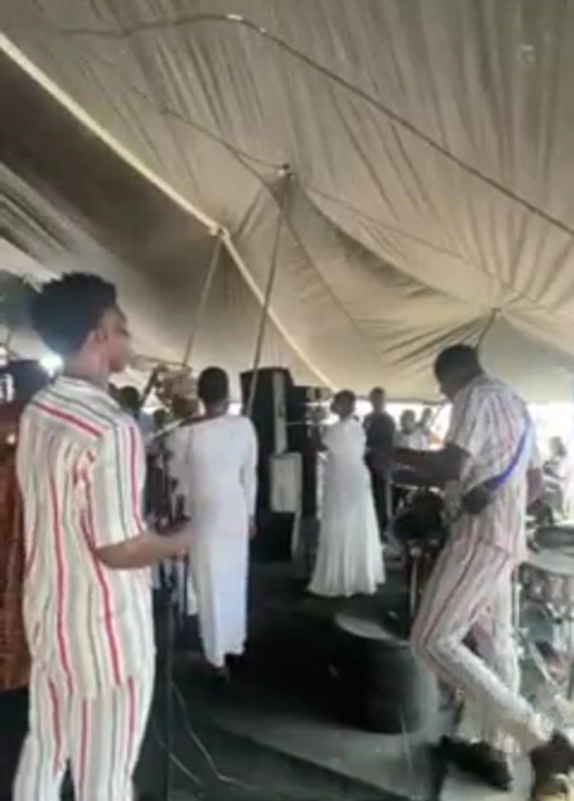 A low-angle view shows a choir and band performing under a large tent. The foreground shows two black men wearing matching vertical striped jumpsuits: one is singing into a microphone, and the other is playing conga drums. Further away from the camera, several black women dressed in long white dresses are singing. Behind them are speakers and other members of the band playing instruments. The tent is supported by metal poles. The ground under the performers is mostly black. The lighting is bright.