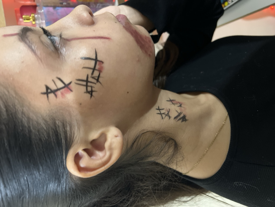A close-up profile view captures a female individual from her right side, displaying elaborate artistic makeup on her face and neck. Her right cheek features black crosshatch marks with red accents, suggestive of stitches or scars. A distinct red line extends vertically from above her right eye. The area around her lower lip and chin is smudged with a dark red substance. Similar black crosshatch marks, also with red accents, are present on the right side of her neck. She is dressed in a black long-sleeved top and wears a thin gold chain necklace. The background is blurred, indicating an indoor environment, with several translucent bottles containing colored liquids visible on the far right, consistent with a personal vanity or dressing area. The image provides no identifiable visual information to determine a specific location within Caen, France.
