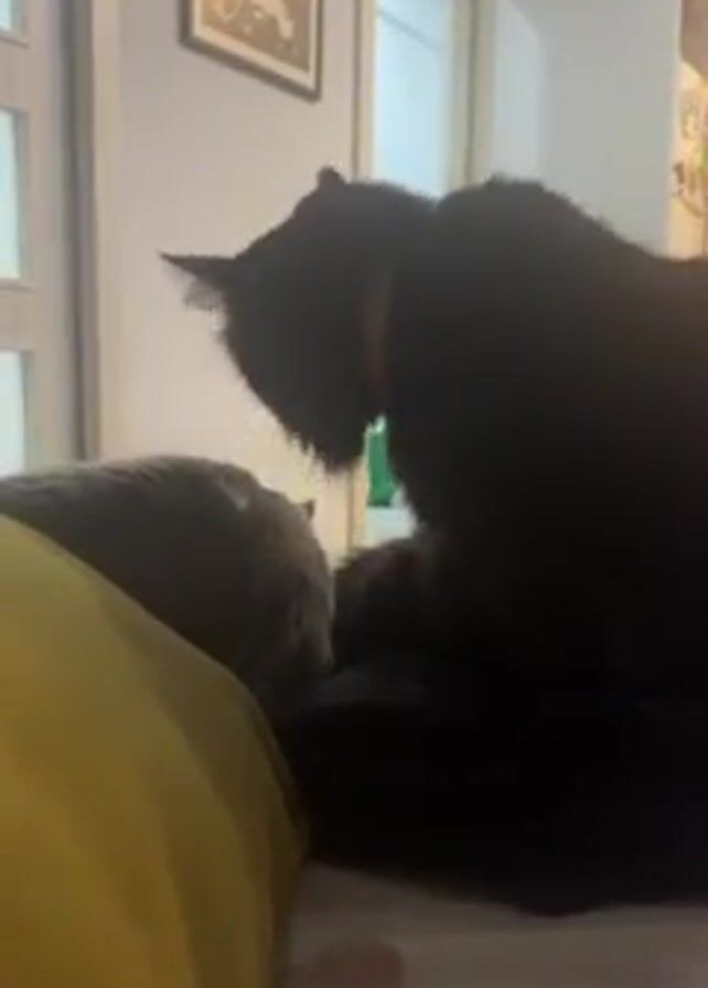 A close-up shot reveals a black cat grooming a gray cat on a bed, with a yellow pillow visible in the foreground
