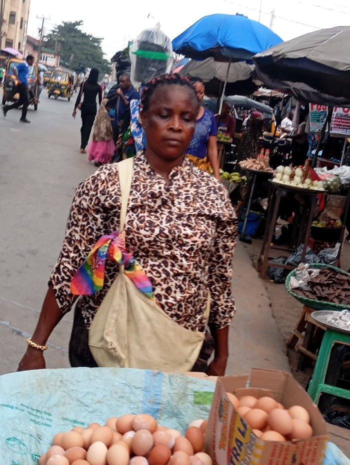 A woman in a leopard-print shirt and crossbody bag stands in a bustling outdoor market. She faces the camera, appearing solemn. Before her is a display of brown eggs, some loose and others in a carton. The market features vendors under blue umbrellas, selling fruits, vegetables, and other goods. People and vehicles move in the background, suggesting a busy day in the market.