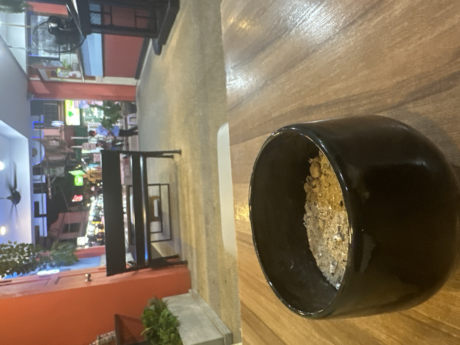 The image depicts a nighttime street scene in บ้านบางรักษ์, Thailand, viewed from a slightly elevated interior or semi-open dining area. In the immediate foreground, a black, glazed ceramic container, filled with cigarette ash and soil, rests on a light brown wooden table with visible grain. Behind the table, a black metal bench with a backrest is positioned, facing towards the street. Further back, another black table is visible beneath the bench. To the left, a reddish-orange wall with a doorframe is present, featuring a planter containing green foliage at its base. Overhead, artificial green vines hang from the ceiling structure, where a black ceiling fan is also visible. To the right, a section of a red wall with a light blue horizontal stripe is visible, along with a partial view of a black floor-standing fan. The floor of this area is a light-colored concrete or tiled surface. The background reveals a bustling urban street at night, illuminated by numerous artificial lights from shops and streetlights. Several buildings with various signs line the thoroughfare. On the street, at least one individual wearing a light blue shirt is standing, facing left, with other indistinct figures further down the street. The overall environment suggests an active commercial area.