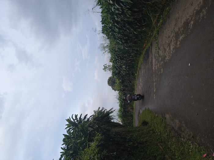 A narrow paved road stretches into the distance, flanked by dense green vegetation. A lone motorcycle moves along the road. The sky above is overcast with varying shades of gray and white clouds. The lighting suggests a somewhat dull or cloudy day. The scene conveys a sense of rural quietude.