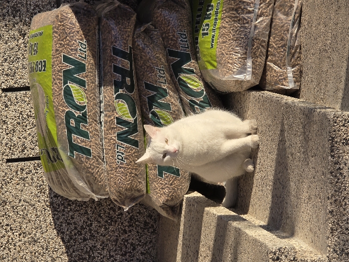 This image depicts an outdoor scene in Drazhevo, Bulgaria. A white-furred cat is centrally positioned, sitting upright on a light-colored, coarse-textured concrete step. The cat faces directly forward, with its eyes partially open; one eye appears pinkish-red, the other green-yellow. To the right and behind the cat, a stack of clear plastic bags filled with light brown wood pellets is visible. These bags are branded "TRON Ltd." with a green leaf logo and feature "ECO PELLET 15 Kg" text. Additional textured concrete steps are visible to the left of the cat, extending downwards. A light-colored, textured wall is present in the background. The scene is illuminated by strong, directional sunlight, casting distinct shadows on the steps and wall.