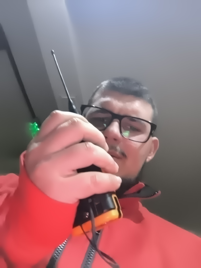 - "A male individual is depicted indoors, holding a black and orange walkie-talkie with a prominent antenna in his right hand" by FM-EkMCu1, licensed under CC BY 4.0
