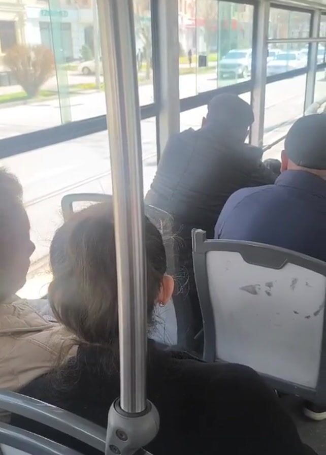 The camera is placed inside a tram, positioned behind two women who are sitting down