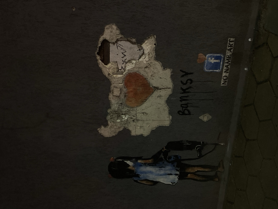 The image depicts a section of a dark gray or black wall in Plovdiv, Bulgaria, at night. On the left, a stenciled or painted figure of a young girl is seen from behind, wearing a light blue dress and dark pigtails with red ties. She is holding and operating a black jackhammer pointed downwards towards the hexagonal paver sidewalk. To her right and slightly above, a large section of the wall's plaster has peeled away, revealing a lighter, irregular shape resembling the map of Bulgaria. Within this exposed area, a reddish-brown heart is painted over the approximate center of the country's outline. Further right within the peeled section, faint graffiti is discernible. Below the map-shaped damage, the word "Banksy" is spray-painted in black with paint drips. Below this, a blue square sticker with the white "f" Facebook logo is present, topped by a small orange heart. Directly beneath the Facebook logo, a white sticker or stencil reads "NO NAME ART." The scene is illuminated by an external light source, casting a subtle glow on the wall and sidewalk.
