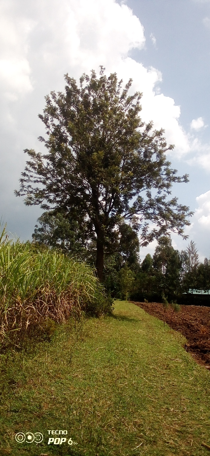 The image displays an agricultural landscape within Lugari ward, Kenya. A large, mature tree with a dense green canopy stands centrally, partially silhouetted against a sky featuring both white cumulus clouds and darker, overcast areas. To the immediate left of the foreground, a thick cluster of tall, green, reedy plants, consistent with sugarcane, is present. A narrow strip of short, maintained green grass runs from the foreground into the midground, separating the reedy plants from an expanse of dark brown, freshly tilled earth on the right. Scattered within this tilled soil and along its edge are several small, newly planted saplings. The background consists of a dense treeline composed of various species. No individuals or animals are visible. A 'TECNO POP 6 Go' watermark is located in the lower-left corner.
