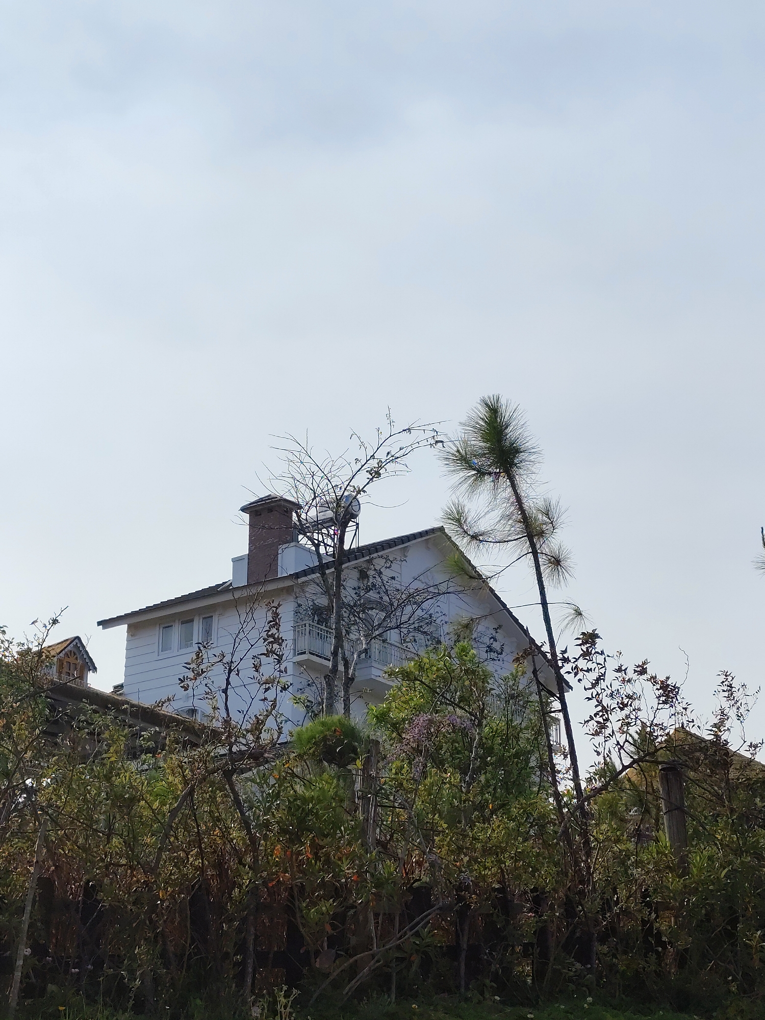 The image displays an upward-angled view of a multi-story white building partially obscured by dense vegetation, set against a bright, hazy sky. The architecture, characterized by white horizontal siding, a dark-pitched roof, and a prominent reddish-brown brick chimney, is consistent with French colonial-era or similar European-style villas found in Dalat, Vietnam. A solar water heater or similar tank-like apparatus is visible on the roof next to the chimney. White-framed windows are present on the upper stories, and a small balcony with a white metal railing extends from one section. To the left, a distinct smaller roof structure with a pointed dormer featuring a small window is visible. The foreground and mid-ground are dominated by a dense thicket of green bushes, some with darker foliage, and numerous bare or sparsely leafed tree branches, effectively screening the lower portions of the building. A tall, slender pine tree with vibrant green needles stands on the right side of the frame, its crown extending above the building's roofline. Faint purple blossoms are interspersed within the mid-ground greenery. The sky above is a bright, uniform light blue to white, suggesting an overcast or hazy daylight condition. No individuals or discernible activities are present in the scene. A specific street address or precise location within Dalat cannot be determined from the provided visual information alone, but the architectural style is typical of the city.