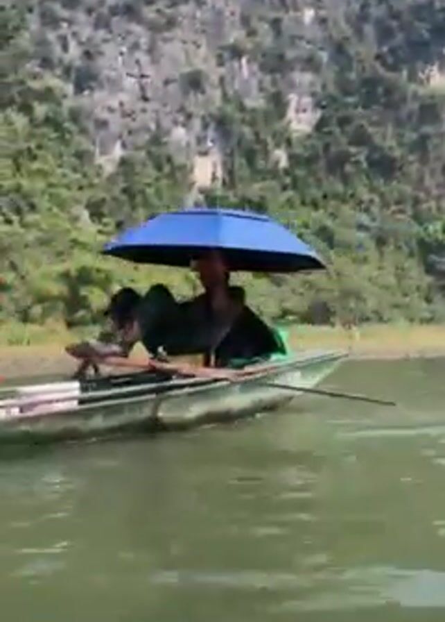 green boat on a river, carrying three people. Two passengers, a man and a woman, are seated at the front, wearing orange life vests. At the rear is a person who is rowing the boat. The boat is equipped with a blue sunshade. The surrounding environment features lush, green-covered mountains with gray rock faces, creating a scenic landscape. The water surface is slightly rippled.