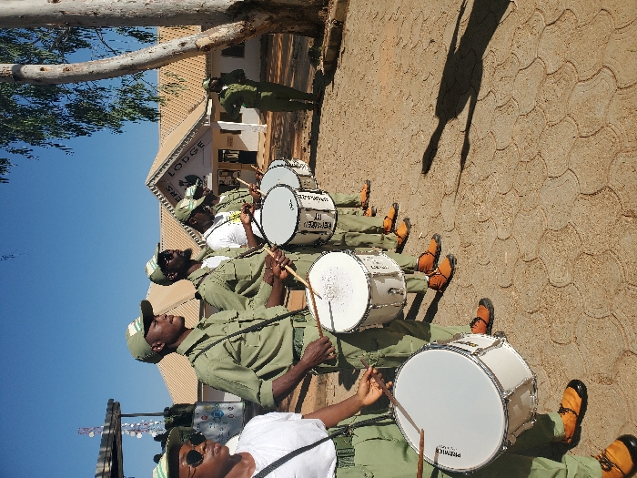 The image depicts an outdoor daytime scene in Jos, Nigeria, positioned in front of a building identified by a sign as "Staffers Lodge." Six individuals are present, all attired in olive green uniforms consistent with the National Youth Service Corps (NYSC), comprising shirts, trousers, and caps featuring a green and white band. Five individuals are arranged in a diagonal line in the foreground, each holding a white snare drum with silver rims and two wooden drumsticks. At least one drum visibly displays "PREMIER" branding. These individuals wear brown and black shoes; three are also wearing sunglasses. A sixth individual stands further back on the right side of the frame, near two light-barked trees, also in uniform with hands on hips, appearing to observe the group. The ground surface is paved with light brown interlocked concrete blocks arranged in a scallop or shell pattern. The sky above is clear and blue. In the distant background on the far left, structures resembling communication towers are partially visible. Shadows cast on the ground indicate bright, overhead sunlight.