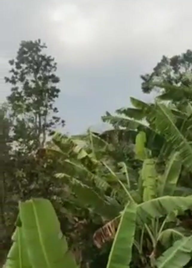 collection of trees, including banana trees and palm trees, against an overcast sky. The wind is blowing, causing the leaves of the trees to move. The overall environment appears to be a lush, tropical landscape.