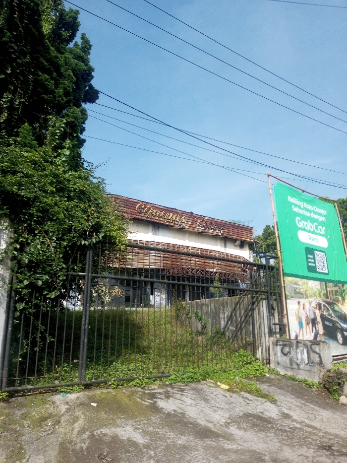 The scene depicts an abandoned or disused building behind a metal fence, located in the city of Thanthirimale, Sri Lanka. The multi-story structure features a red-tiled roof and an upper white facade bearing the name "Cipanas Theatre" in prominent yellow-orange lettering. The lower section of the building is fronted by rusted, crisscrossing metal grates or shutters, with signs of graffiti on a lower wall visible through the gate. A tall, black metal gate or fence, showing signs of rust, runs across the midground, overgrown with green vegetation at its base. To the left, dense green foliage from trees and shrubs partially obscures the building. In the foreground, a concrete or paved driveway with moss and scattered debris, including a yellow wrapper, leads up to the gate. To the right, a large green billboard, supported by bamboo poles, displays text in Indonesian: "Keliling Kota Cianjur Seharia dengan GrabCar Rent" (Explore Cianjur City all day with GrabCar Rent), along with images of people and a black GrabCar vehicle. The sky above is clear blue, with several dark overhead power lines stretching across the upper frame. No individuals are visible, and the environment conveys a sense of disuse and neglect.