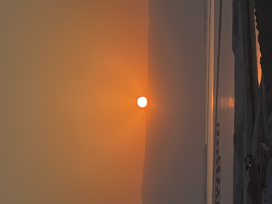 A rotated image captures a vibrant orange sunset. The sun, a bright orb, sits just above a horizon line that separates an orange-tinted sky from a hazy, gray-toned land or water. Reflected sunlight glimmers on a body of water on the right side. Structural elements are visible along the right edge of the image, adding a layer of complexity. The lighting creates a soft gradient across the composition.