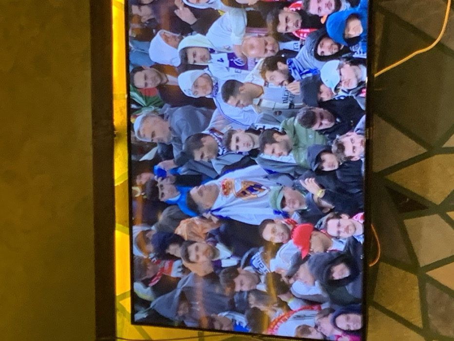 A rectangular television screen is visible, displaying a dense crowd of individuals within what appears to be a stadium setting. The screen itself is situated against a dark, textured wall with geometric patterns, illuminated by an orange-yellow light from above. A white cable extends from the bottom right edge of the screen. The content on the screen features an assembly of predominantly adult males, varying in age. Many individuals are wearing winter clothing, including jackets, hoodies, and scarves. A prominent figure in the upper-middle section of the screen is draped in a white banner or flag featuring the crest of Real Madrid. Other visible fan apparel includes scarves in shades of blue, white, and red, as well as several white hooded sweatshirts. One person in the upper left holds a blue object, and another nearby has an arm raised, potentially holding a mobile phone. The individuals are packed closely together, generally looking forward or slightly upward, indicative of observing an event. This image depicts a screen located within the city of Casablanca, Morocco.