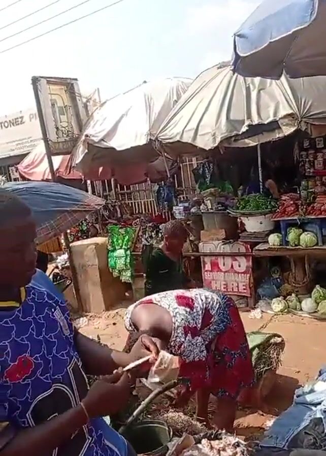 bustling outdoor market scene. Several people are visible, including a woman in a red and white floral dress bending over what appears to be produce on the ground. A man wearing a blue and purple patterned shirt sits nearby. Other people are milling around the market stalls, which are covered by umbrellas. The stalls display a variety of goods, including vegetables, fruits, and other items. The environment appears to be a busy commercial area, possibly in a developing country. Power lines are visible overhead. The general atmosphere seems lively and full of activity.