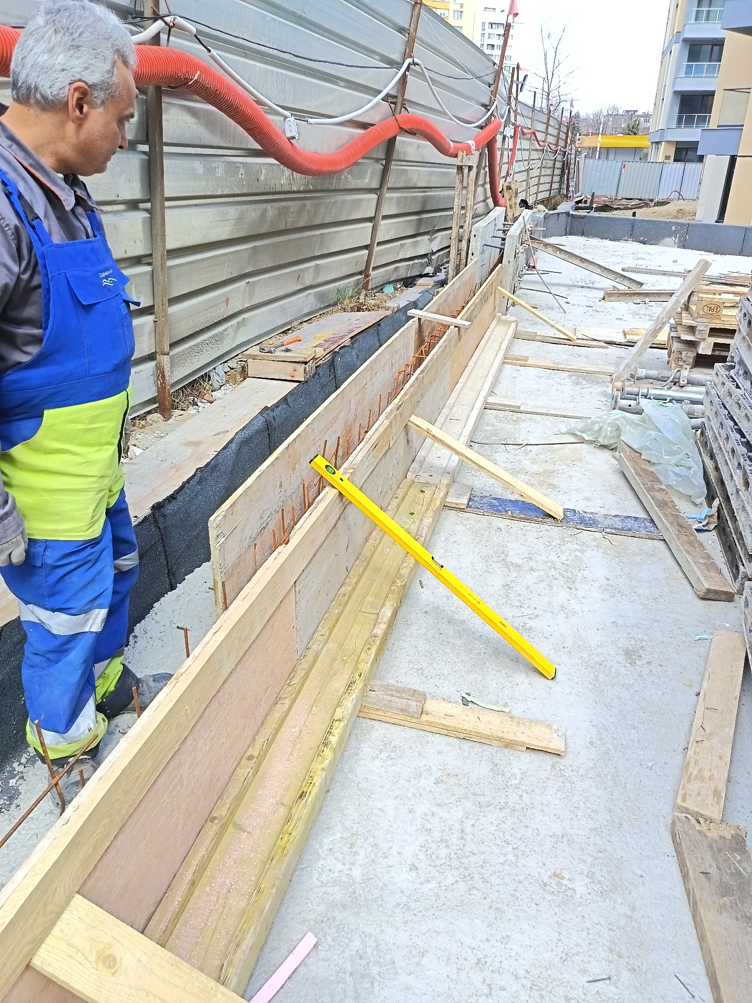 The image depicts an active construction site, identified as part of the Codelia Park residential complex in the Ovcha Kupel district of Sofia, Bulgaria. In the foreground, a male worker, appearing middle-aged with grey hair, is observed in left profile. He wears a grey long-sleeved shirt under blue and neon yellow work overalls, emblazoned with a "Codelia Park" logo on the bib, and grey work gloves. His gaze is directed downwards and to his right, towards the ongoing construction. The immediate ground consists of a grey concrete slab, partially covered with debris including wooden offcuts, nails, and a white plastic sheet. Along the left side, a section of wooden formwork (shuttering) is in place, containing visible reinforcing steel bars (rebar) protruding from a layer of white aggregate. A black, textured waterproofing membrane is visible between the formwork and a dark, possibly gravel-filled, trench. A yellow spirit level lies diagonally across a section of the wooden formwork. In the mid-ground, behind the formwork and the worker, a tall corrugated metal fence acts as a boundary. Red flexible ventilation hoses and white electrical conduits are attached to the upper section of this fence. Beyond the fence, a small, bare deciduous tree and a yellow, low-rise structure are visible. To the right, stacks of wooden pallets (one marked "EPAL"), metal scaffolding components, and stacked metal panels are stored. The background features several multi-story modern residential buildings with balconies and glass railings, indicative of contemporary architectural design. The sky is overcast, providing diffuse lighting.