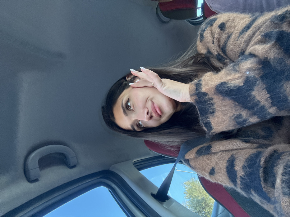 An adult female is depicted seated inside a vehicle during daylight hours, presumably in Kaluđerac, Montenegro. The female, with long dark hair, is wearing a brown and black patterned, fuzzy knit sweater. She is looking upwards and slightly to the viewer's left with a subtle smile. Her left hand is positioned with the palm resting against the side of her face/cheek. The visible fingernails on her left hand are long and styled with white tips. A small, light-colored ring is present on her left ring finger. The vehicle's interior features a light-colored headliner, a grey overhead grab handle, and a dark seat with red accents. A black seatbelt is visible across her upper torso. Through the driver's side window, a clear blue sky and green foliage are visible. No other individuals are present in the immediate frame.