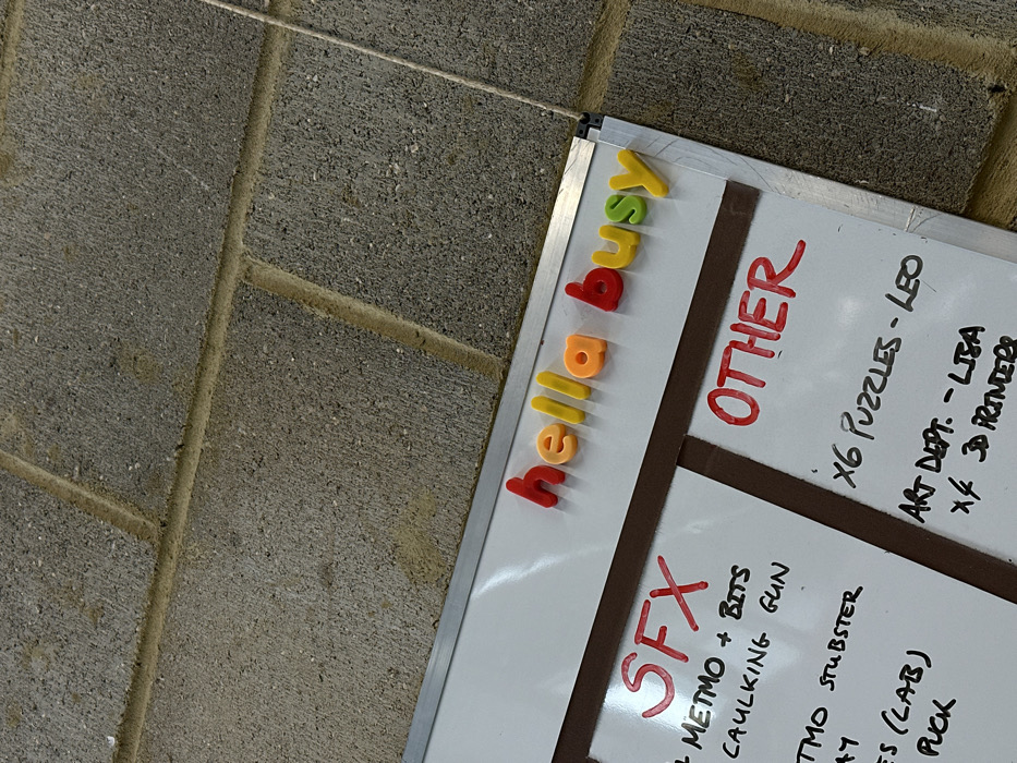 The image depicts an angled, close-up view of a section of a white dry-erase board mounted against a light grey cinder block wall. This scene is located in Hertsmere, United Kingdom. The dry-erase board features a silver-colored aluminum frame. Affixed to its upper central portion are multi-colored magnetic letters spelling "hella busy" in red, orange, yellow, red, and green. Below this message, the board is vertically divided into at least two sections by two strips of brown adhesive tape. The left section is headed "SFX" in red marker. Below this, handwritten text in black ink lists several items: "METMO + BITS", "CAULKING GUN", "METMO STUBSTER", "PLAY", "ES (LAB)", and "PUCK". The right section is headed "OTHER" in red marker. Beneath this, handwritten text in black ink lists: "X6 PUZZLES - LEO", "ART DEPT. - LISA", and "X4 3D PRINTERS". The background consists of a wall constructed from coarse, light grey cinder blocks with prominent, light-colored mortar lines. A thin, light-colored braided string or cord descends diagonally from the upper right corner of the image, passing adjacent to the top right corner of the dry-erase board. No individuals are visible within the frame; the content on the board indicates human organizational activity.