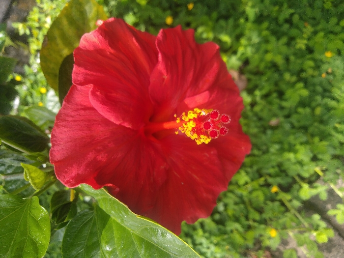 A close-up photograph captures a fully bloomed red hibiscus flower (Hibiscus rosa-sinensis) in a garden setting, located in Cipanas, Indonesia. The central subject is a vibrant red flower, featuring five distinct, ruffled petals. Extending from its core is a red staminal column topped with numerous bright yellow anthers and five small, red, star-shaped stigmas. Surrounding the flower are green leaves of the hibiscus plant, visible in the upper sections of the frame. The background consists of blurred green foliage and ground cover, with faint indications of small yellow flowers. The scene is illuminated by natural daylight. No individuals or actions are depicted.