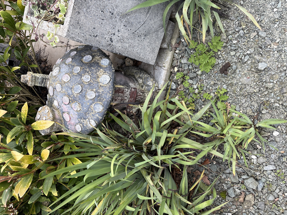 Minsterley, United Kingdom. An outdoor scene features a weathered garden ornament designed as a grey mushroom house with numerous light grey circular spots covering its cap. A smaller, secondary mushroom-like form is present on the cap's left side, and a small, grey chimney protrudes from the cap's right. The ornament's stem is crafted to resemble a rustic house, exhibiting dark brown and reddish-brown vertical markings. The entire ornament shows significant weathering, including reddish discoloration and dirt accumulation. To the left and partially in front of the ornament is a dense clump of green, sword-shaped leaves, characteristic of a Phormium plant. Similar, less dense foliage is present on the lower right. The ground consists of light grey gravel mixed with small stones, interspersed with several clusters of small green herbaceous plants. In the background, behind the ornament and to the left, is dense foliage comprising green and yellowish-green shrubs, some bearing small white flowers. To the right of the mushroom ornament, a large, upright grey concrete block stands, with a lighter grey concrete curb positioned horizontally beneath it. Small green plants emerge from behind the upper section of the concrete block. No individuals or specific actions are depicted.