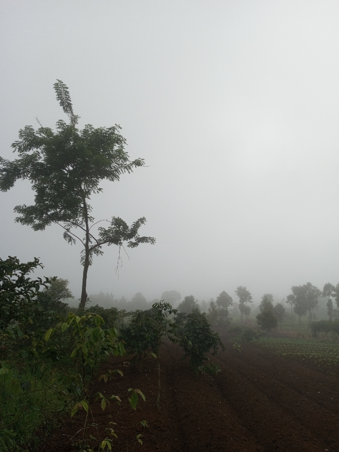A hazy landscape featuring trees and crops. One tall, leafy tree stands prominently on the left, while smaller, bushier plants fill the foreground. Further back, a row of trees fades into the mist-laden distance. Ploughed brown fields slope downward towards the centre. The overall mood is subdued due to the heavy fog, which obscures details and creates a sense of depth.