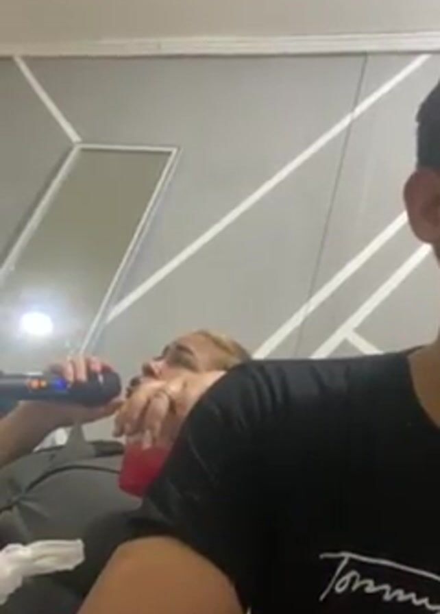 two people in a room. One person is partially visible, wearing a black Tommy Hilfiger t-shirt, and appears to be recording the video. In the background, another person is lying down, holding a microphone and a red cup. The wall behind them is gray with white geometric patterns. The lighting in the room is bright.