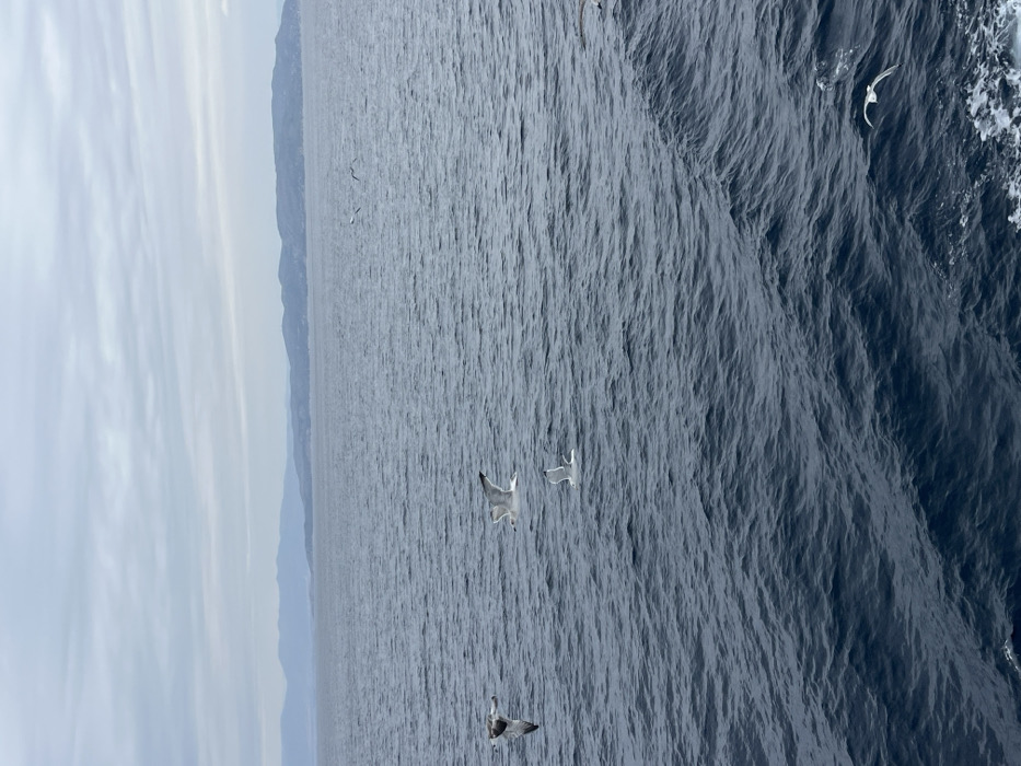 The image displays an open expanse of dark blue water under an overcast sky. The water's surface exhibits numerous ripples and small waves. In the lower-right portion, a white, foamy wake is present, suggesting the vantage point is from a moving vessel. Multiple seagulls are visible throughout the scene. A large gull, predominantly white and grey, is flying low in the lower-left, wings outstretched, oriented left. Another similarly colored gull is flying level in the mid-left, wings spread, oriented right. A third white gull floats on the water in the mid-center. Additional smaller birds are discernible in the distance, either flying or resting on the water. The horizon is defined by a long, hazy, blue-grey landmass, interpreted as distant mountains or islands. The sky is uniformly light grey with subtle horizontal cloud formations, indicating an overcast condition. The visual information does not depict an urban environment or any identifiable features specific to the city of Kypseli, Greece; the scene is entirely a seascape with distant natural landforms.
