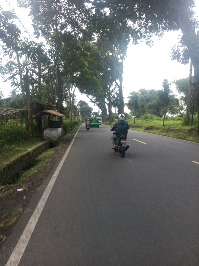 The image depicts a rural or semi-rural asphalt road in Niz Lakuk, India, under an overcast sky. The perspective is from a vehicle traveling forward on the road. In the foreground, a person riding a dark-colored motorcycle is visible from the rear, wearing a dark jacket and a white helmet with a dark pattern. The motorcycle has a visible exhaust pipe on the right side. Ahead of this motorcycle, a second dark-colored motorcycle with a rider is present. Further down the road, a green three-wheeled auto-rickshaw or utility vehicle is observed, followed by a light-colored van or truck in the distance. All vehicles are proceeding in the same direction. The left side of the road features a white solid line marking the edge, followed by a dirt verge and a concrete drainage ditch. Beyond the ditch, a rustic, open-sided structure with a reddish-brown roof is situated, appearing to be a roadside stall or shelter. Dense green foliage, including numerous trees and shrubs, lines the roadside, obscuring the background. Utility poles are also visible among the trees. The right side of the road has a grassy shoulder leading to a dense line of trees and natural vegetation. The terrain beyond the immediate roadside appears to be undeveloped, with distant hills or elevated ground visible on the horizon. Faint yellow road markings are discernible in the center of the asphalt.