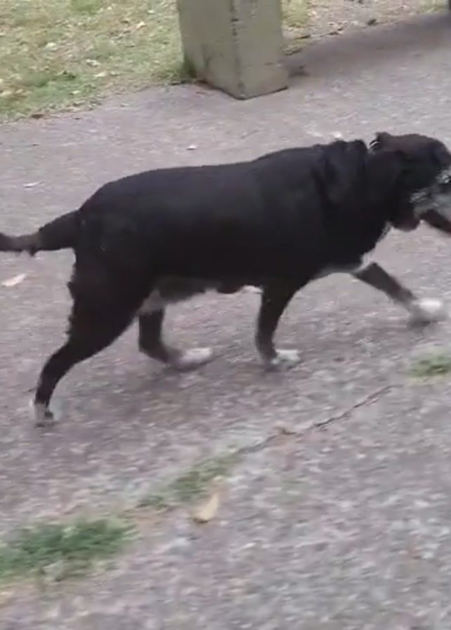 - "A black dog with some white fur around its muzzle walks on a gray concrete and brick patio in an outdoor park setting" by FM-tjajG3, licensed under CC BY 4.0