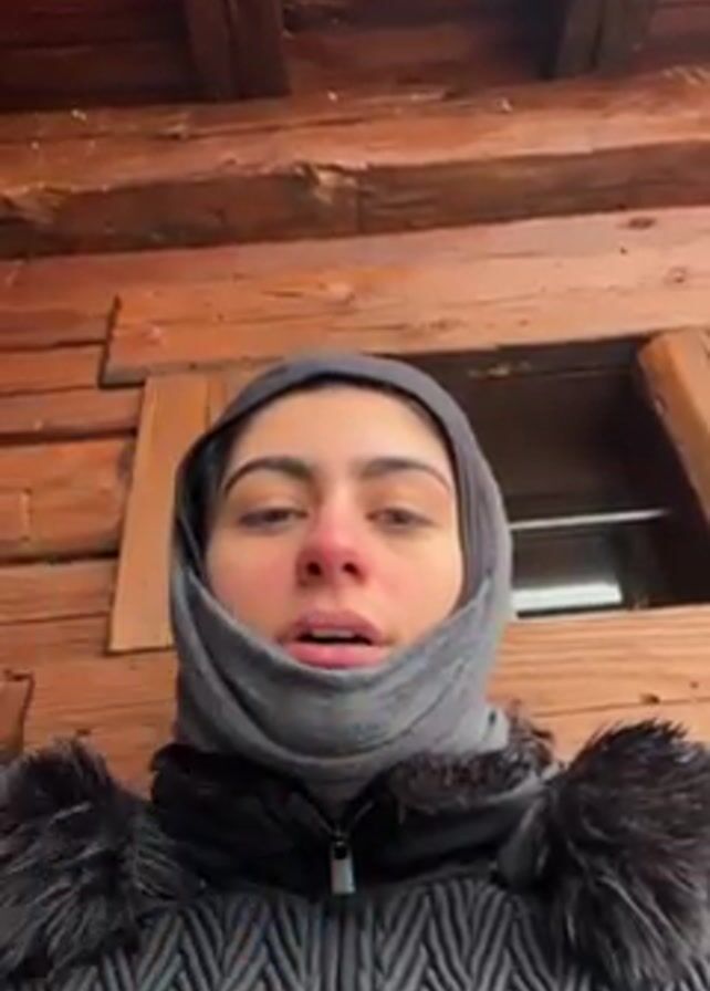 A young woman in a black winter coat with a fur-lined hood and a gray scarf wrapped around her head and neck is standing outside a wooden cabin