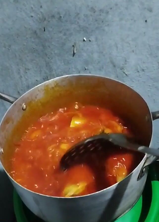 A person stirs a pot of bright red sauce with large pieces of light yellow vegetable, likely squash, in it. The pot is metal, likely aluminum, and sits on top of a green plastic stool. The background is a plain concrete wall. The person uses a slotted spoon with a grey handle. The sauce simmers and splashes with each stirring motion. The scene is close up and well lit.