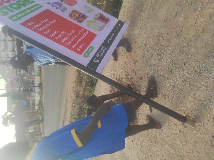 A handheld sign advertises a store that sells and supplies food items. The sign lists specific products like rice, maize flour, plantain flour, gari, amala, palm oil, vegetable oil, sweet potato flour, assorted dry meat, and "more." A phone number for inquiries is displayed. The sign is being held by two people, one wearing a blue shirt with yellow trim, and the other a blue patterned shirt. The setting appears to be outdoors.