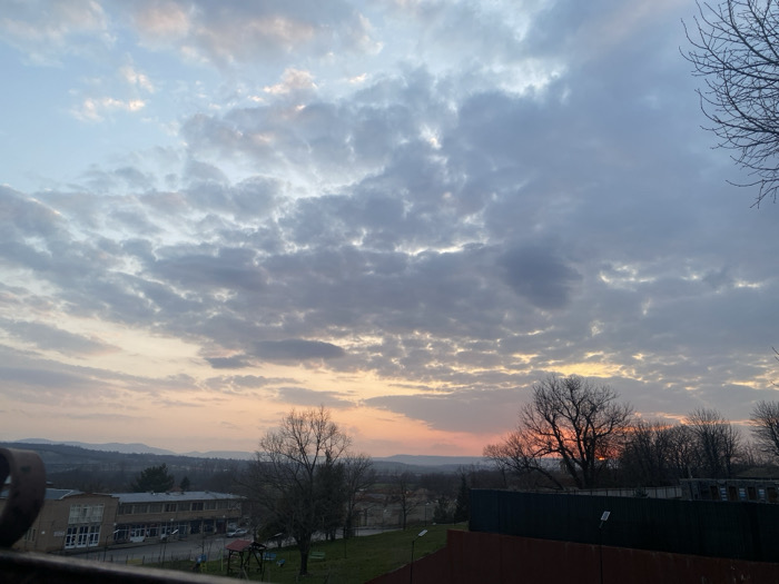 The image depicts an expansive view of Alvanovo, Bulgaria, at either sunrise or sunset. The sky is predominantly overcast with numerous grey and bluish clouds, while the lower horizon exhibits a distinct band of orange and pink light. In the immediate foreground, a dark, curved metallic railing or balustrade partially obstructs the lower-left corner. Below the horizon line, to the left, a light-colored, multi-story building with multiple windows and a flat roof is visible, with several vehicles parked on a paved area in front of it. Adjacent to this building, a small green area features playground equipment, including a slide and swing set. Throughout the midground, several large, bare deciduous trees are silhouetted against the sky, particularly on the right side. Further right, a dark, solid wall or fence-like structure runs horizontally, partially obscuring additional buildings and trees behind it. Distant hills or mountains form the far horizon across the left and central background. No individuals or specific actions are discernible.