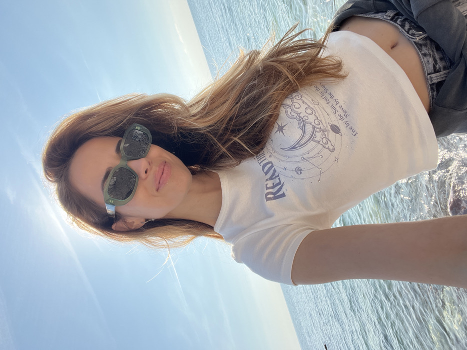 A forensic description of the image reveals a young adult female posing for a selfie on a sunny day at a coastal location in Bar, Montenegro. She stands near the water's edge of the Adriatic Sea, with small waves gently lapping at the rocky shore in the foreground. The subject is light-skinned, has long wavy brown hair, and wears large olive-green, rectangular sunglasses. A small, star-shaped earring is visible on her left ear. She wears a cropped, off-white, short-sleeved t-shirt featuring a detailed graphic design. The design includes a crescent moon, clouds, stars, and celestial/astrological symbols arranged in a circle, with partial text reading "READ THE" at the top and "Live by the Sun, feel by the Move by the Story" at the bottom. Her midriff is exposed, and she appears to be wearing dark-colored jeans or shorts with a dark grey garment, possibly a hoodie, tied around her waist. She presents a subtle smile towards the camera. The background consists of a clear blue sky, bright with sunlight, causing a distinct lens flare in the upper left quadrant. The calm, blue-green waters of the sea extend to the horizon.