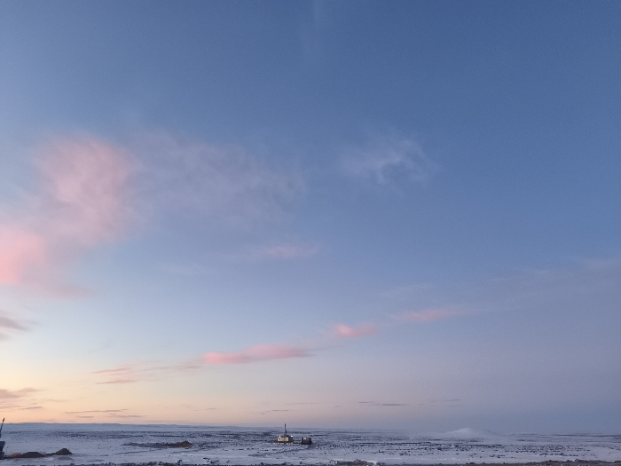 A vast, snow-covered landscape stretches to the horizon under a pale blue sky. Delicate pink clouds drift across the sky, illuminated by the setting or rising sun. In the distance, a low-lying mountain range is visible. A small structure, possibly a building or industrial facility, stands in the middle of the field. The foreground shows patches of earth poking through the snow cover.