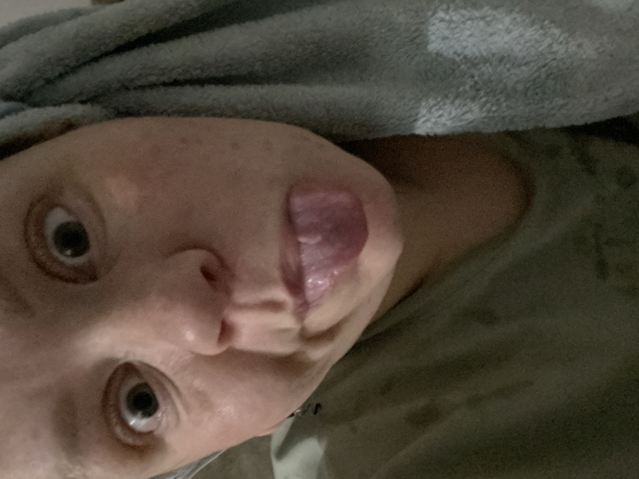 A person's face occupies the majority of the frame, tilted towards the left. The tongue is extended, appearing purple, while the eyes are wide and staring towards the camera. Above the head is a gray, textured material, potentially a towel. The person seems to be lying down, with a gray or olive-green material visible in the background. The lighting is somewhat dim, casting shadows across the face.
