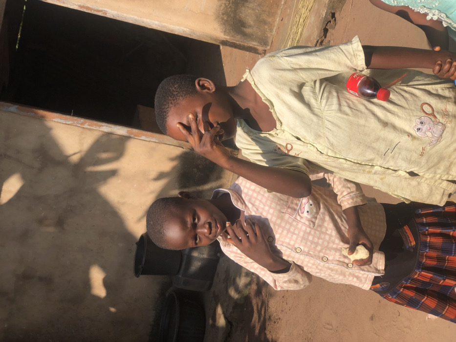 This image depicts an outdoor scene in Orifite, Nigeria, under bright sunlight, indicated by pronounced shadows on the building wall behind the subjects. Two young individuals, appearing to be children, are positioned in the foreground. The individual on the left, with dark skin and short dark hair, wears a light pink checkered long-sleeved shirt with a left chest pocket featuring a cartoon patch, and a dark skirt with an orange and blue plaid pattern. This child is holding a piece of light-colored food, possibly bread, near their mouth with their right hand and is looking directly towards the camera. The individual on the right, also with dark skin and short dark hair, wears a light yellow short-sleeved button-down top with a ruffled collar and an embroidered design on the lower front. This child has their left hand raised, fingers splayed, covering part of their face, seemingly shielding their eyes from the sun. A small red plastic bottle with a white cap is tucked into the right side of their garment. In the bottom right corner, a hand wearing a light blue garment is visible, holding the right hand of the child on the right. The background features a light brown, textured building wall with an open dark doorway on the right, framed by lighter wood. To the left of the doorway, a stack of black plastic buckets is visible against the wall. The ground beneath the individuals is reddish-brown earth.