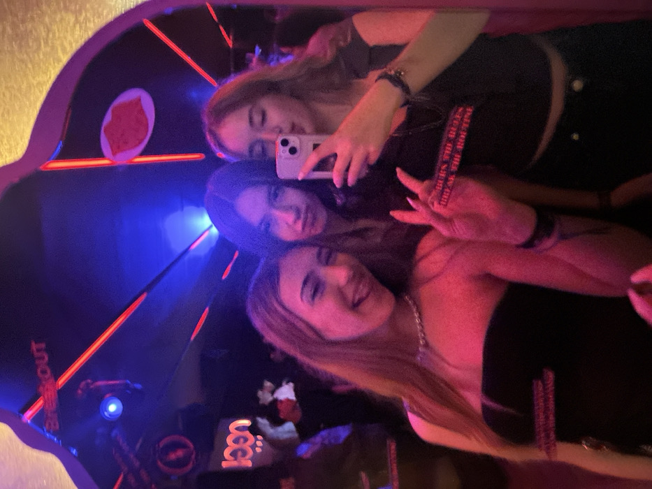 This image depicts three young adult females reflected in a mirror, taking a selfie inside the "1000 Club" in Barcelos, Portugal