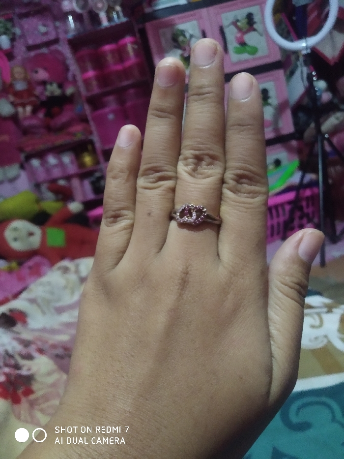 A human hand, exhibiting a medium-tan skin tone, is presented in the foreground, viewed dorsally with fingers slightly extended. A silver-toned ring is worn on the fourth finger of the left hand. The ring features two intertwined, opposing C-shaped elements, encrusted with small, clear stones, creating a horizontal oval design. The inner portion of these C-elements appears to have a slightly darker, possibly reddish, infill. The background is significantly out of focus, predominantly colored in various shades of pink and magenta. To the left, a pink shelving unit contains several pink containers. Below this, a red doll with a light-colored face is partially visible, resting on a patterned surface. To the right, pink framed pictures featuring images resembling Mickey Mouse are discernible. A white circular object, possibly a ring light or decorative hoop, is visible in the upper right. The lower background shows a patterned blanket or bedspread with hues of brown, white, and teal. A watermark "SHOT ON REDMI 7 AI DUAL CAMERA" is present in the lower-left corner of the image. The scene is located in a domestic setting, allegedly within the city of Cipinang, Indonesia.