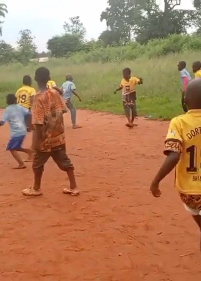 A group of about a dozen children are playing soccer on a dirt field. They are of varying heights and weights and appear to be of African descent. Many of the children are wearing soccer jerseys, including some wearing yellow jerseys with “DORTMUND” and the number “19” on the back. Some of the children are barefoot, while others are wearing shoes. The children are actively running around the field, kicking and chasing a soccer ball. The camera position is low, positioned behind one of the children, providing a view of the field and the other players. The field is surrounded by green grass and trees, suggesting it is a rural or semi-rural area. The overall atmosphere seems energetic and playful, typical of children enjoying a game of soccer.