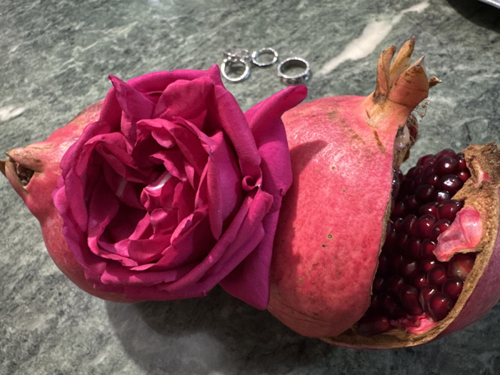 The scene, set in Kvakhvreli, Georgia, depicts a static arrangement of objects on a polished, mottled dark green stone surface. Central to the image are two pomegranates. One pomegranate, situated on the left, is largely intact and a reddish-pink in color. Resting on its upper surface is a fully bloomed magenta-pink rose. The second pomegranate, positioned to the right, is vertically split open, revealing numerous dark red, translucent arils packed within its internal cavity. In the upper background, three silver-toned rings are visible on the stone surface: a plain band, followed by a solitaire ring featuring a clear central stone, and then another plain band. Direct illumination from the upper-left casts distinct shadows from the fruits and rose towards the lower-right of the frame. No individuals are present.