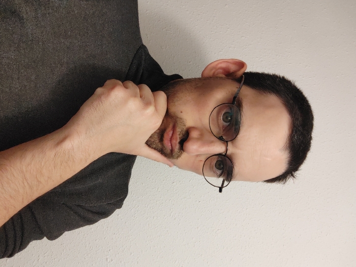 A man is pictured with his hand on his chin, appearing to be in thought or contemplation. He has short dark hair, a beard, and wears round glasses. He is dressed in a dark gray shirt, standing against a plain white wall. The image is rotated, positioning the man sideways.