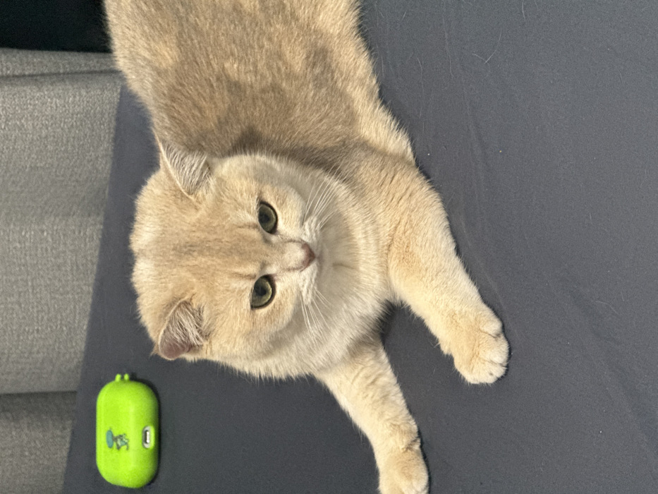 - "A light-tan to cream-colored feline, likely a British Shorthair, with green eyes and a light pink nose, lies prone on a dark gray fabric surface" by FM-UFsim1, licensed under CC BY 4.0