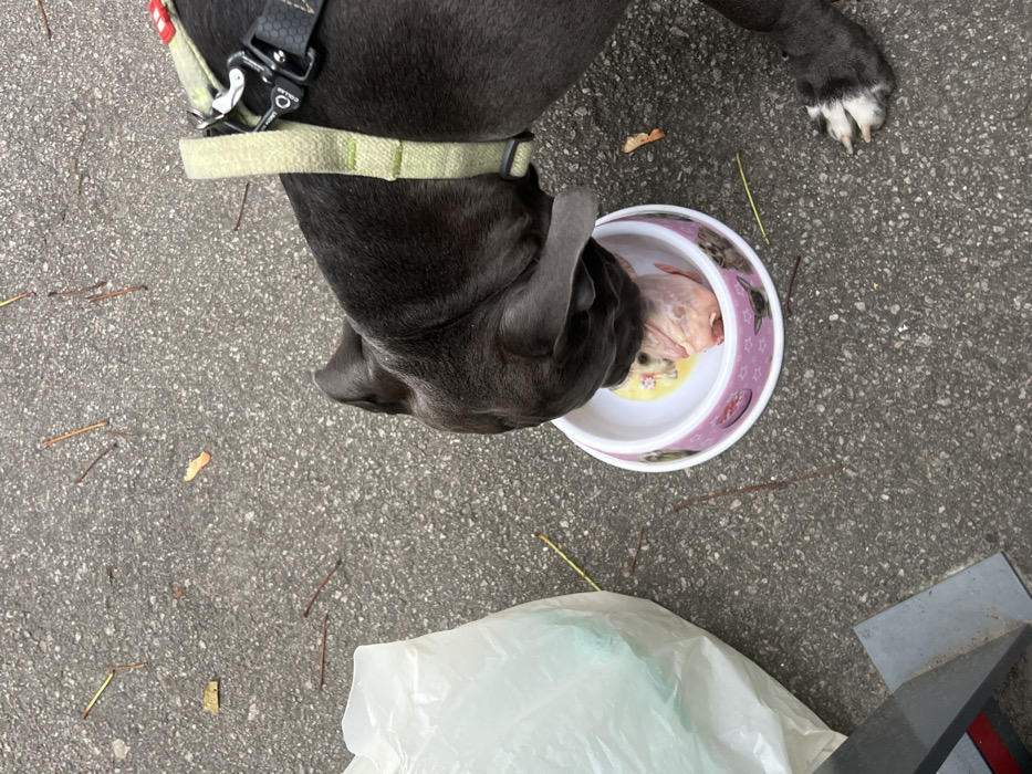 - "An overhead, slightly angled shot depicts a dark grey pit bull type dog actively consuming raw meat from a pink plastic food bowl on an asphalt surface" by FM-u4czX2, licensed under CC BY 4.0