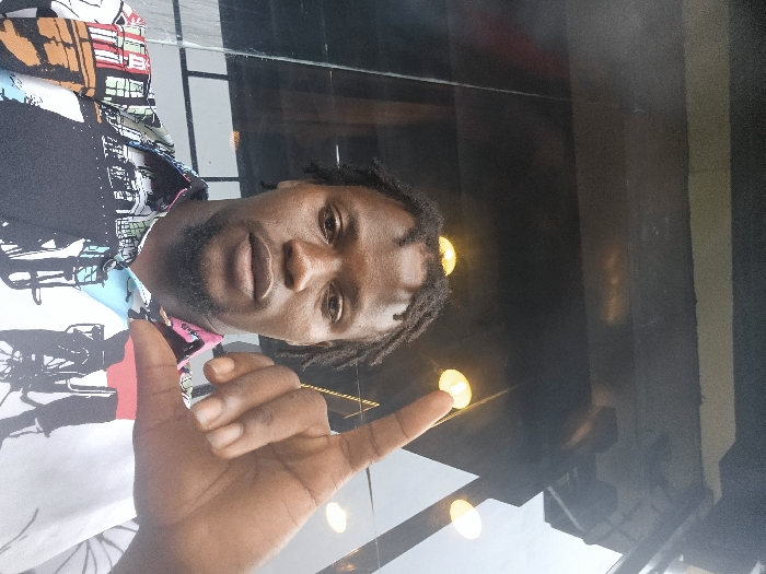 A single adult male is positioned in the foreground of a close-up, slightly low-angle photograph. He has dark skin, short, dark dreadlocks or braids, and a short beard with a mustache. He wears a short-sleeved, collared shirt with a multi-colored print depicting urban scenes, including buildings and bicycles. His right hand is raised on the right side of the frame, forming an 'L' shape with the thumb and index finger extended. He gazes directly at the camera with a neutral facial expression. The background consists of reflections on a large glass surface, revealing several circular, glowing yellow-orange light sources and dark structural components consistent with an overhead ceiling or awning. The scene is located in a building featuring glass panels in the City of Unknown, Unknown.